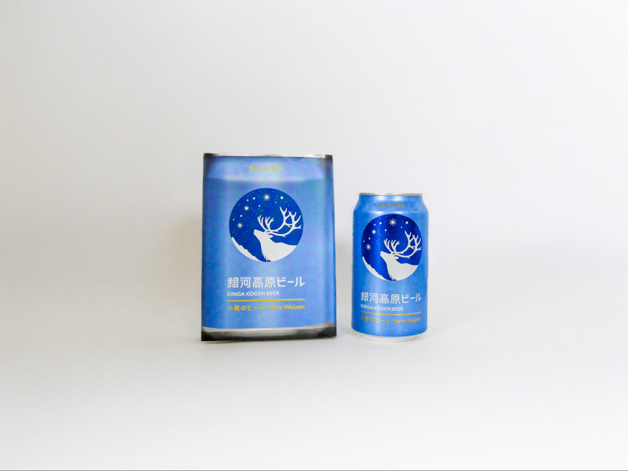 「実際の銀河高原ビールの缶の質感や色味をどう再現するか、そして一目で “缶” とわかる仕上がりにするにはどうすればよいか。グラデーションの加減をはじめ、細かなディテールについても印刷会社さんと綿密に相談を重ね、細部まで作り込んでいます」